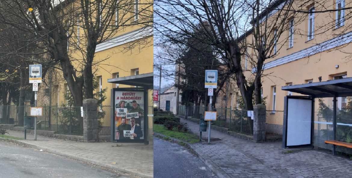 A piliscsabai iskola előtt korábban megjelent, az ellenzéket háborús felelősnek tartó fideszes plakát eltűnt a buszmegállóból. Lehetséges, hogy a bérleti idő lejárt, vagy a helyi lakosság tiltakozása érte el célját. A plakát, amelyen az „Együtt a háborúért!” felirat olvasható, a tiszai Ruszin-Szendi Romuluszt ábrázolja a „sorkatonaság” táblával, míg mellette von der Leyen és Zelenszkij képe mellett szerepel Magyar Péter is. E kampányt a fideszes politikus, Apáti Bence által alapított Nemzeti Ellenállás Mozgalom finanszírozza.